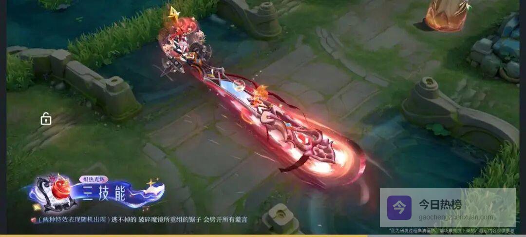 另一个大招特效是甩出一条苹果皮,小矮人在苹果皮上奔跑。这个没有什么新奇的,我还是比较喜欢安琪拉骑在电锯上,用电锯打人的感觉。现实中大家不要模仿安琪拉玩电锯哟。