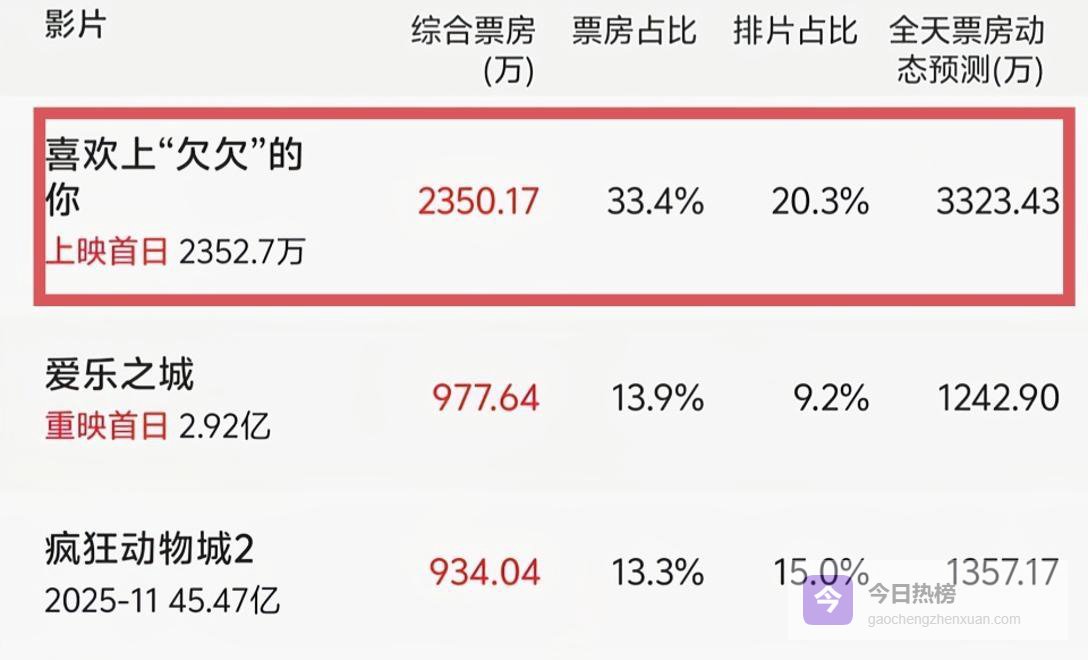 2月14日情人节,电影《喜欢上“欠欠”的你》上映,截至发稿,总票房2350.17万,占33.4%,排片占20.3%,各项数据远超同期影片《爱乐之城》《藏地情书》《营救汪星人》,就连连续热映半个月的《疯狂动物城2》也被挤到单日票房第三。
