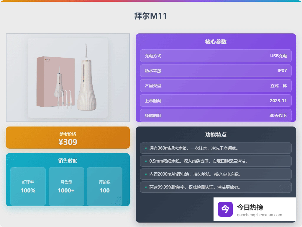 3. 超大360ml水箱和可拆卸设计,基本一水一冲,省得频繁加水。IPX8级防水保证使用安全,不怕水花乱溅。配上2000mAh大容量电池,电量耐用不用频繁充电,随时随地都能享受深度洁净。