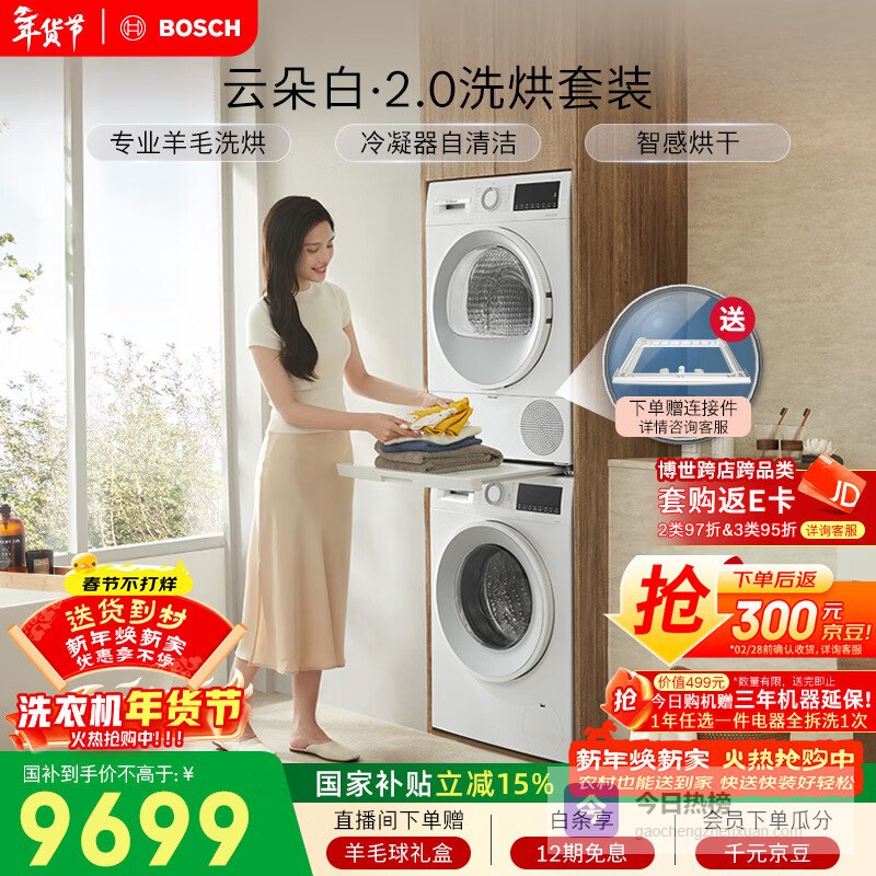 博世(BOSCH)云朵白2.0 大容量洗衣机 羊毛洗烘 热泵烘干 洗烘套装WGA152000W+WQA254D00W ¥