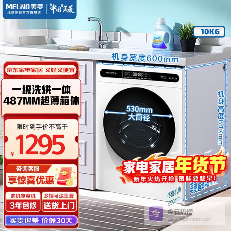 美菱(MeiLing)洗衣机10公斤家用大容量一键全自动超薄可嵌入除螨洗一级能效变频节能低噪洗烘一体补贴滚筒洗衣机 G100M14528BH-极地白 洗烘一体 10kg¥
