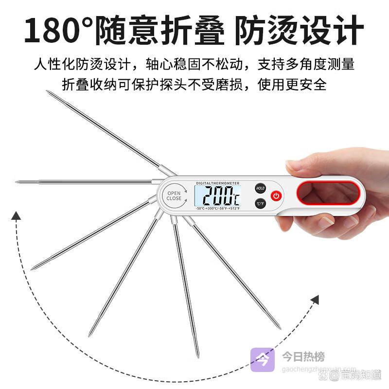 3️⃣折叠便携设计:折叠后的温度计体积小巧,便于放入厨房抽屉或随身携带,适合于各种场合使用。无论是家庭聚会还是户外烧烤,它都能随时随地为您提供精确的温度支持。