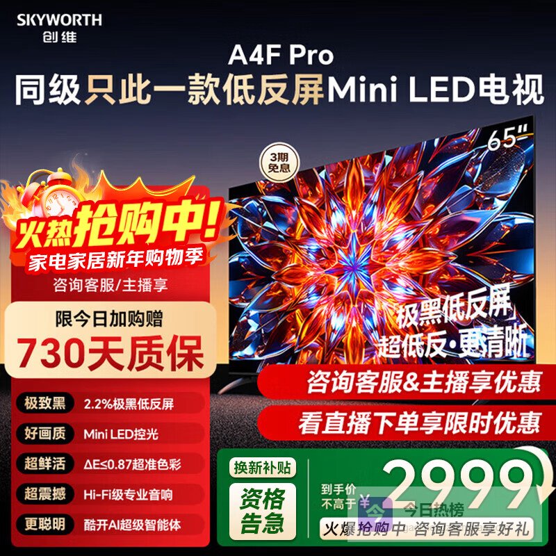 创维电视65英寸65A4F Pro 65英寸Mini Led 144Hz高刷 4+64G 低反屏防抖 4K智能液晶平板电视机 65英寸 A4F升级款 65英寸 咨询客服享好礼¥