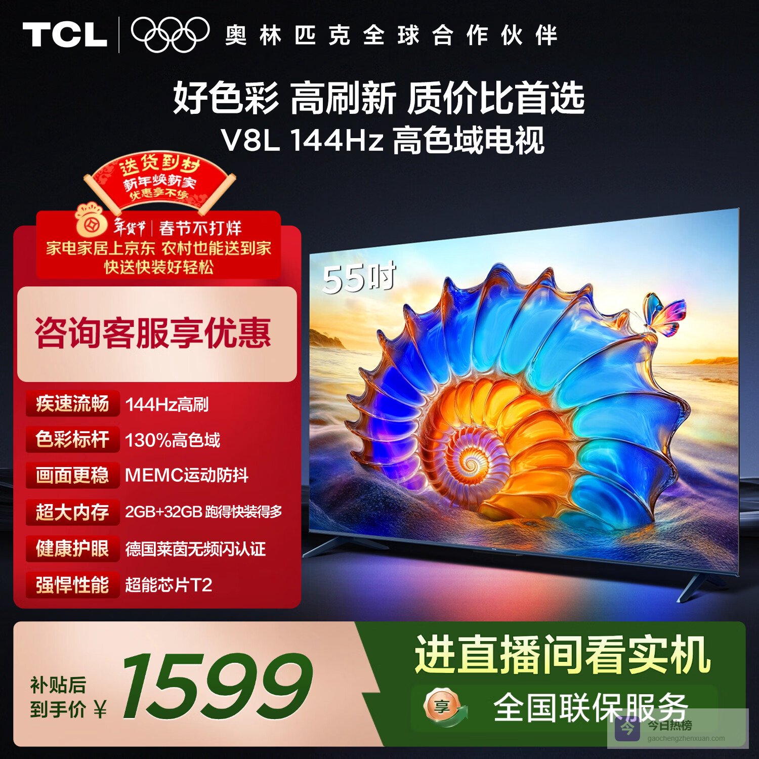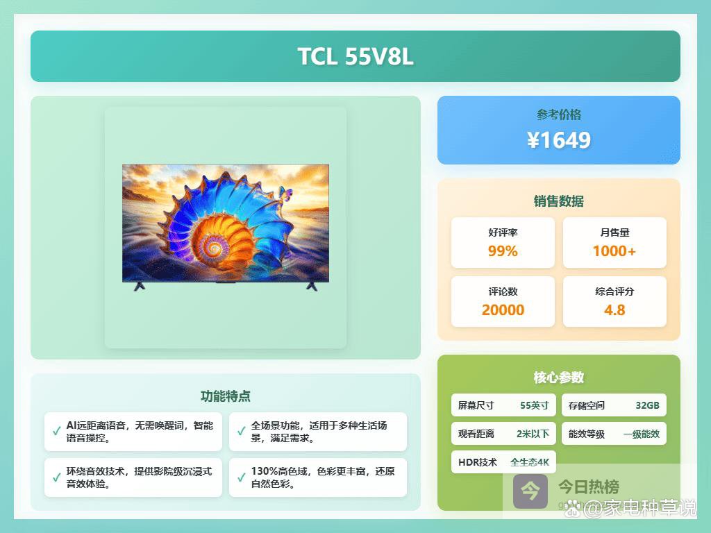 四、TCL【高色彩表现】这台55V8L支持130%的高色域,可以呈现出电影级别的原色效果,色彩变得更加丰富和自然。不管是看电影还是玩游戏,色彩都还原得挺真实,让你感觉像身临其境一样,画面色彩更鲜亮、更细腻,体验会更棒一些。