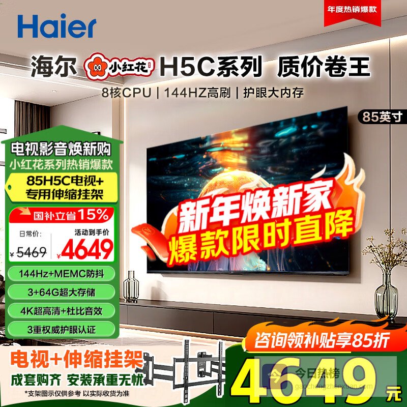 海尔(Haier)电视 85英寸高刷超薄AI语音全面屏智能音画质 MEMC防抖 大屏超高清平板电视机 85英寸 H5C升级版+伸缩挂架¥