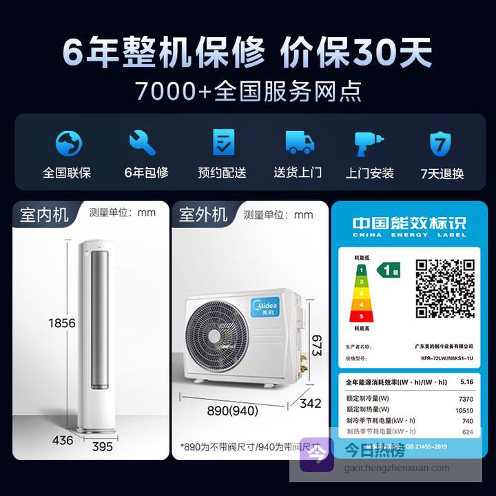 ①这款空调搭载了美芝双转子压缩机和双排28组铜管换热器,制冷量高达7370W,制热量10510W,能快速覆盖32-48㎡的空间,适合大客厅或开放式厨房。