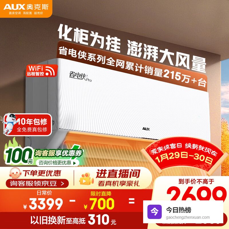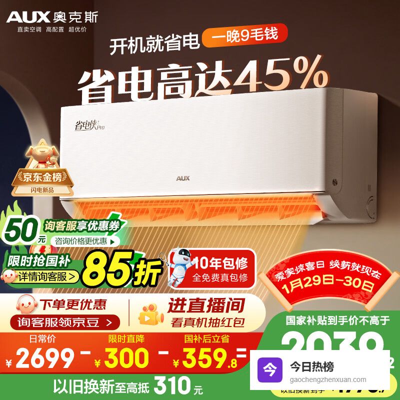【京东自营】奥克斯空调省电侠Pro2匹新一级能效变频冷暖客厅Wifi智控挂机铜管国家补贴KFR-46¥