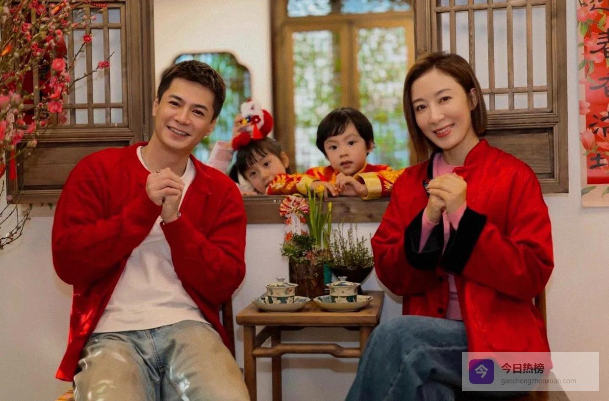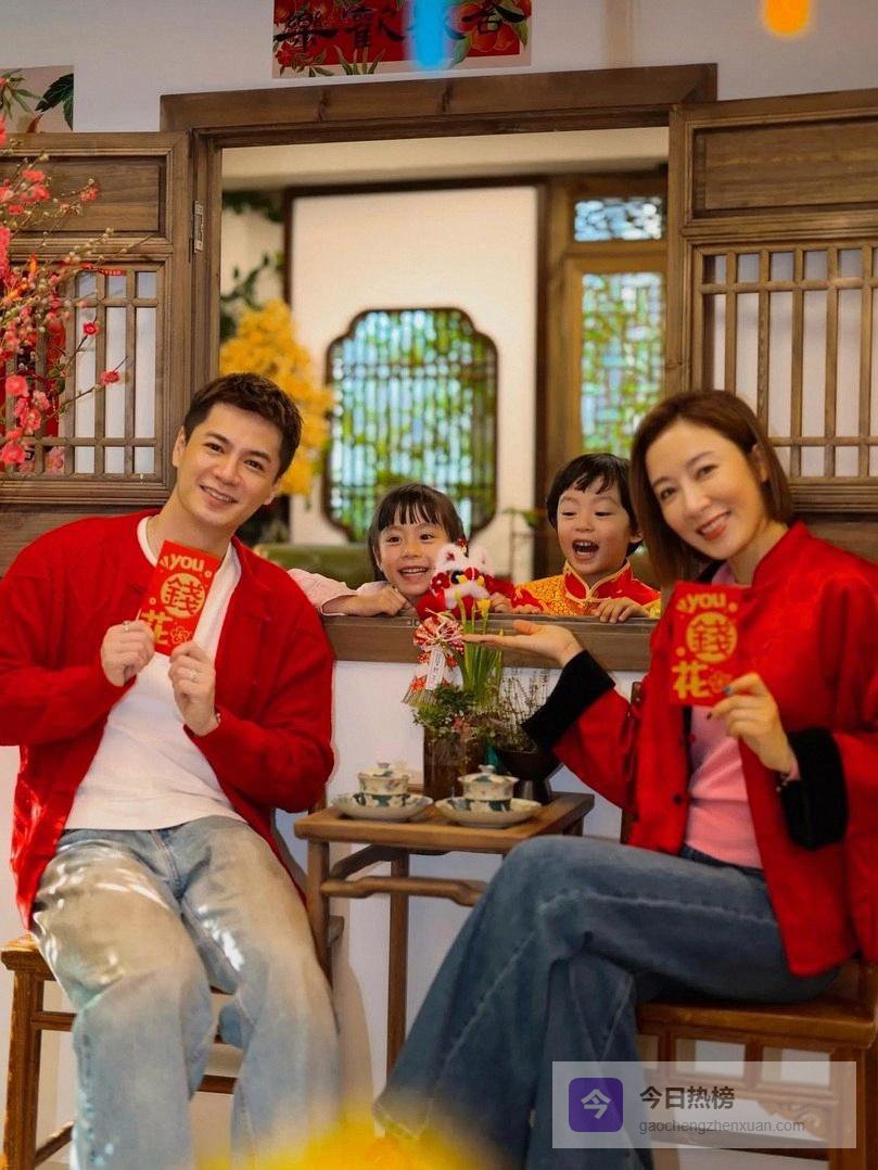 这次他们挑了个很巧的构图,爸妈坐在椅子上送祝福,姐弟俩在窗台后探出脑袋,两个小脑袋一左一右,露着整齐的小白牙,画面不用修饰就有年味
