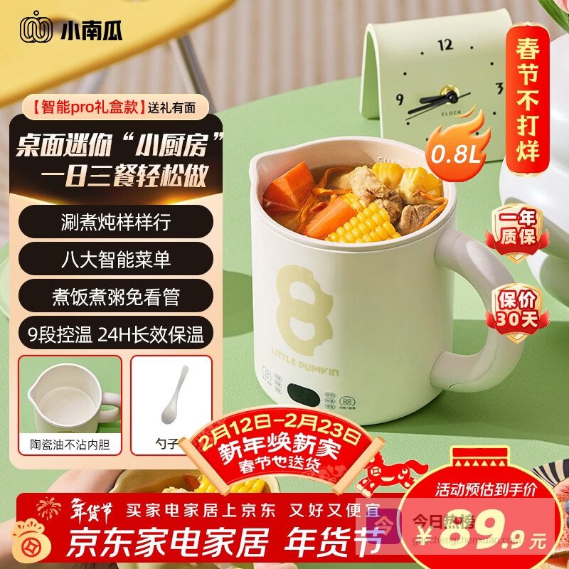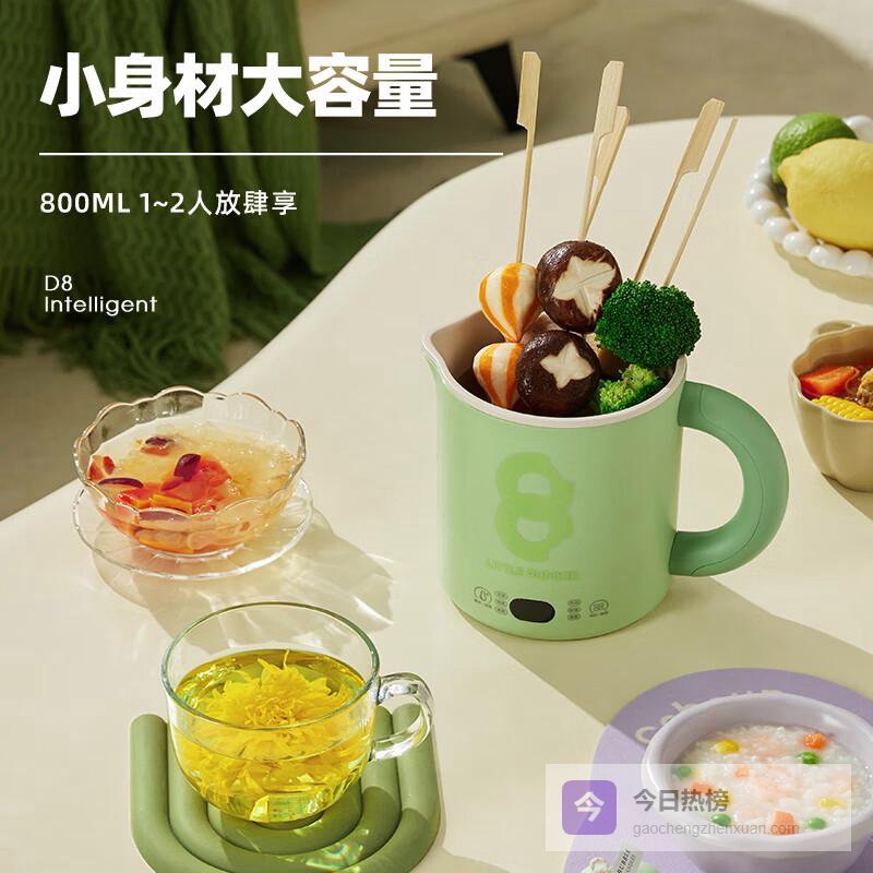 点评:这款小南瓜升级智能煮饭的电热水壶,容量只有0.8升,体积小巧,携带和收纳都特别方便,特别适合在宿舍、办公室或者外出旅行用。它不仅能用来快速烧水,大约9分钟就可以搞定,还配备了智能多功能菜单,可以煮粥、炖汤、焖饭、热奶,甚至还能做甜品。多种功能都支持定时预约和长时间保温,随时享受热腾腾的美食,非常贴合现代人的快节奏生活。