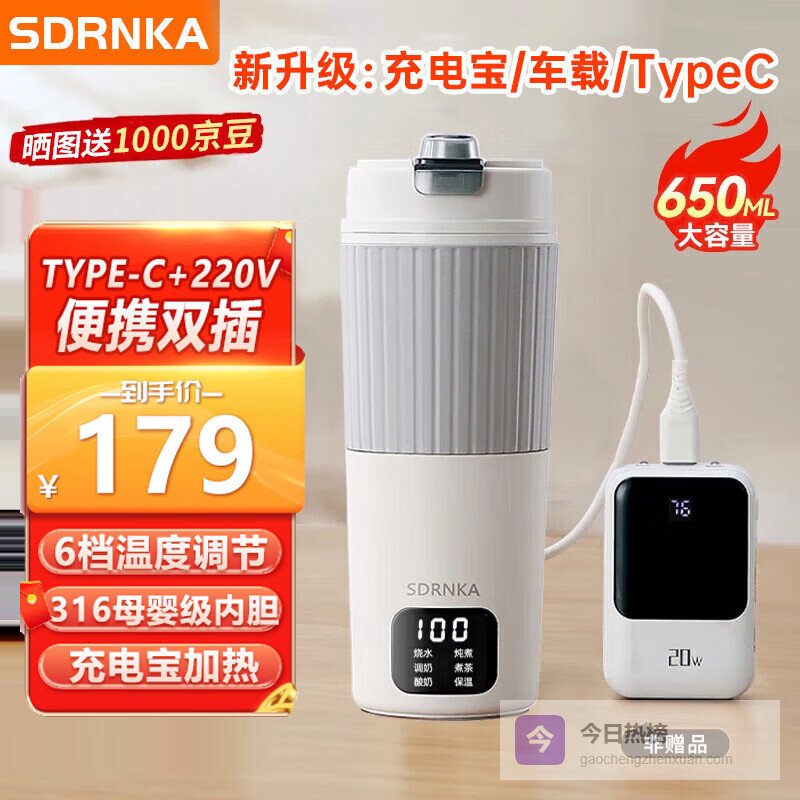 SDRNKA日本便携式烧水壶USB烧水杯650ML旅行电热水壶316内胆车载typec保温一体家用养生全自动恒温热水杯 0.65L 炖煮款:升级TypeC/220V双插¥