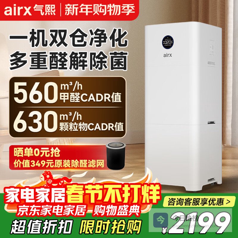 【京东自营】气熙空气净化器高效分解甲醛除烟味异味双重全屋净化负离子除雾霾粉尘PM2.5双舱净化器B6¥
