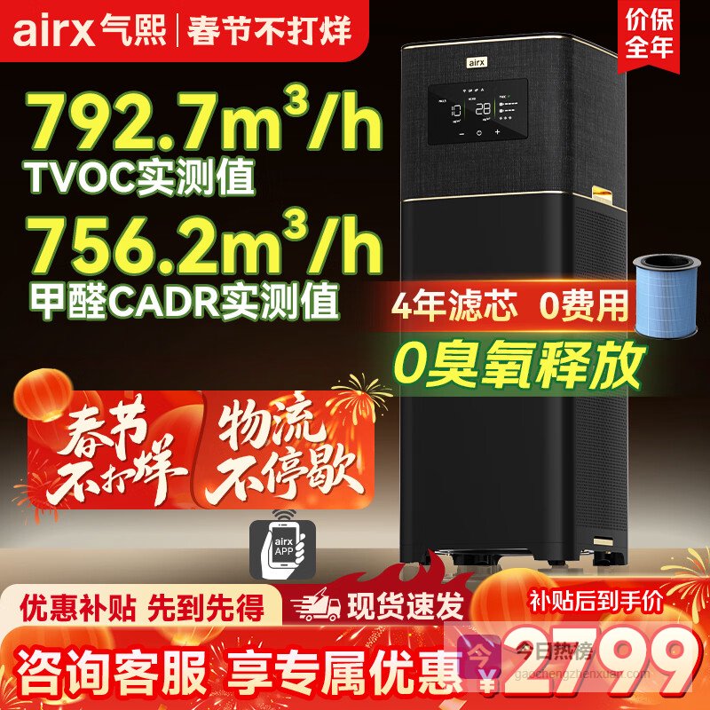 【品牌直营】气熙airx黑金空气净化器0臭氧释放家用除甲醛除TVOC除菌异味除尘烟味除过敏原宠物毛新¥