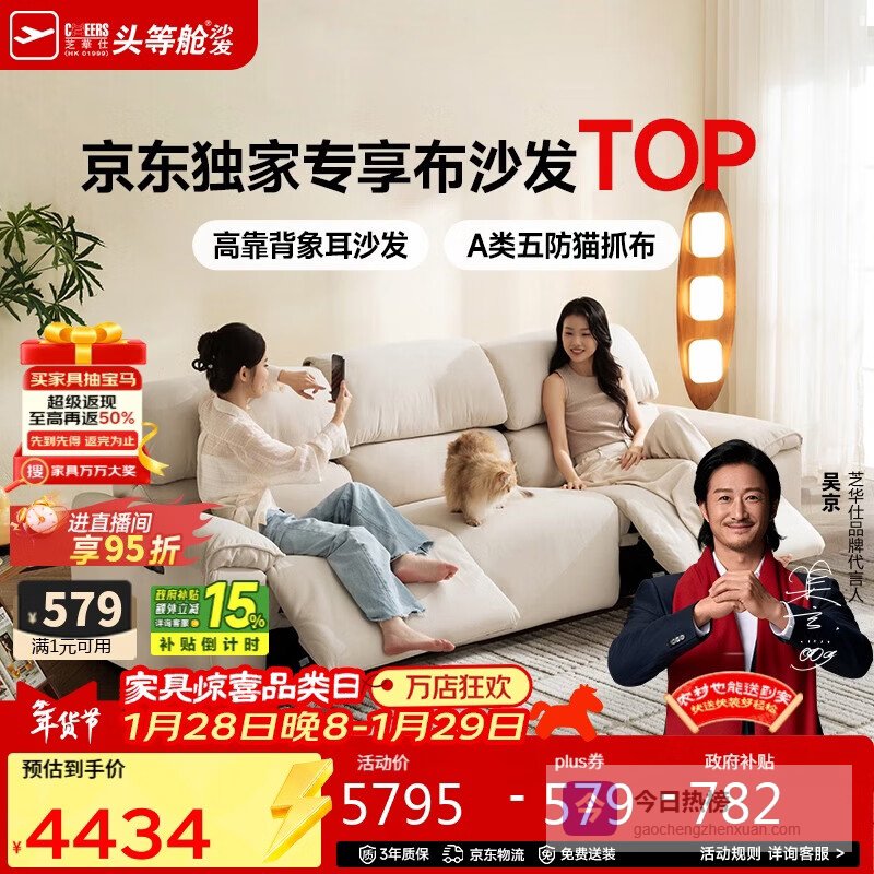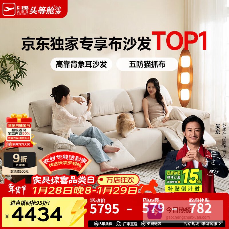 【京东自营】芝华仕头等舱大象耳朵30665猫抓布艺电动沙发白2.76m小户型直排沙发客厅¥