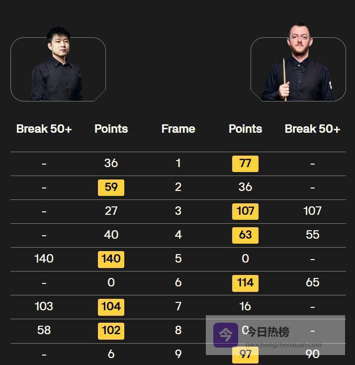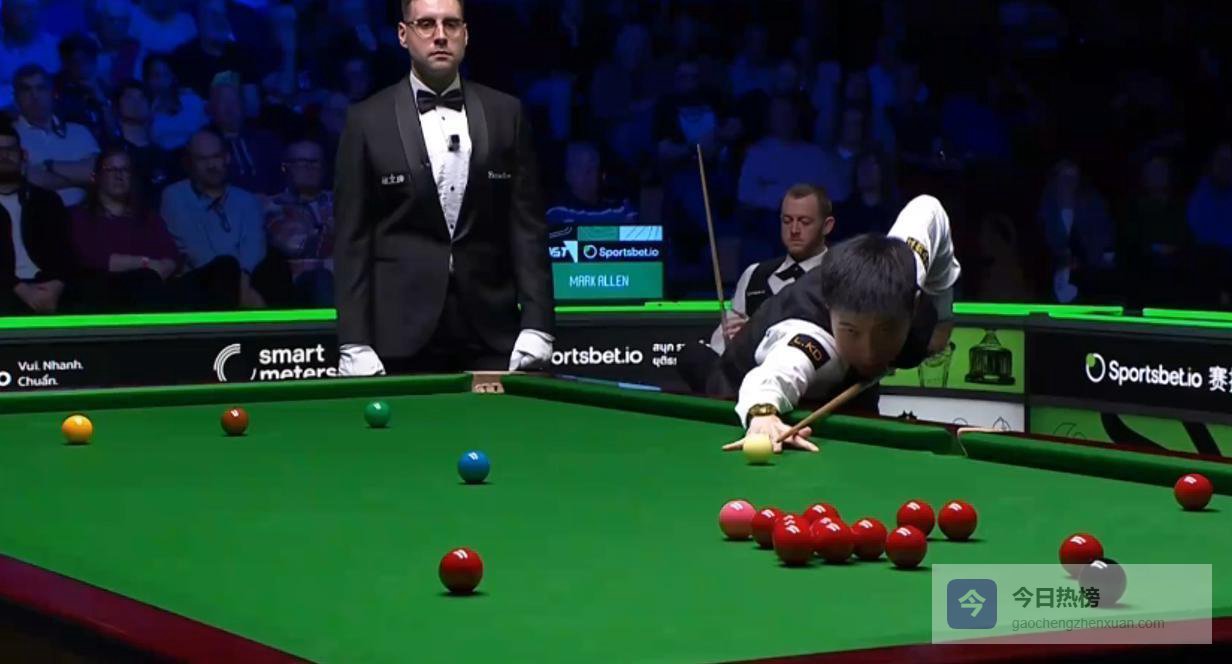 随后的几局,双方你来我往,艾伦也曾打出单杆114分再次拉开比分。 但赵心童没有放弃,在第七局和第八局,他又分别贡献了单杆103分和102分,顽强地将比分追成4-4平。 第九局,艾伦顶住压力拿下,率先拿到赛点。