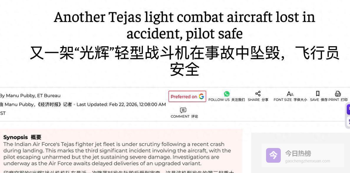2026年2月初,印度空军的“光辉”战斗机又出事了。 根据印度媒体的报道,一架单座型“光辉”在降落阶段坠毁,幸运的是飞行员没有受重伤。