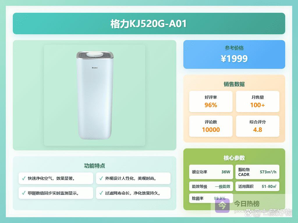 五、格力这款格力KJ520G-A01的甲醛数显功能挺贴心的,试了下,房间里的甲醛、PM2.5一目了然,再也不用靠猜测。空气质量一变,数显就能直接跳出来,让你知道空气是不是“合格”,不用担心隐藏的污染。