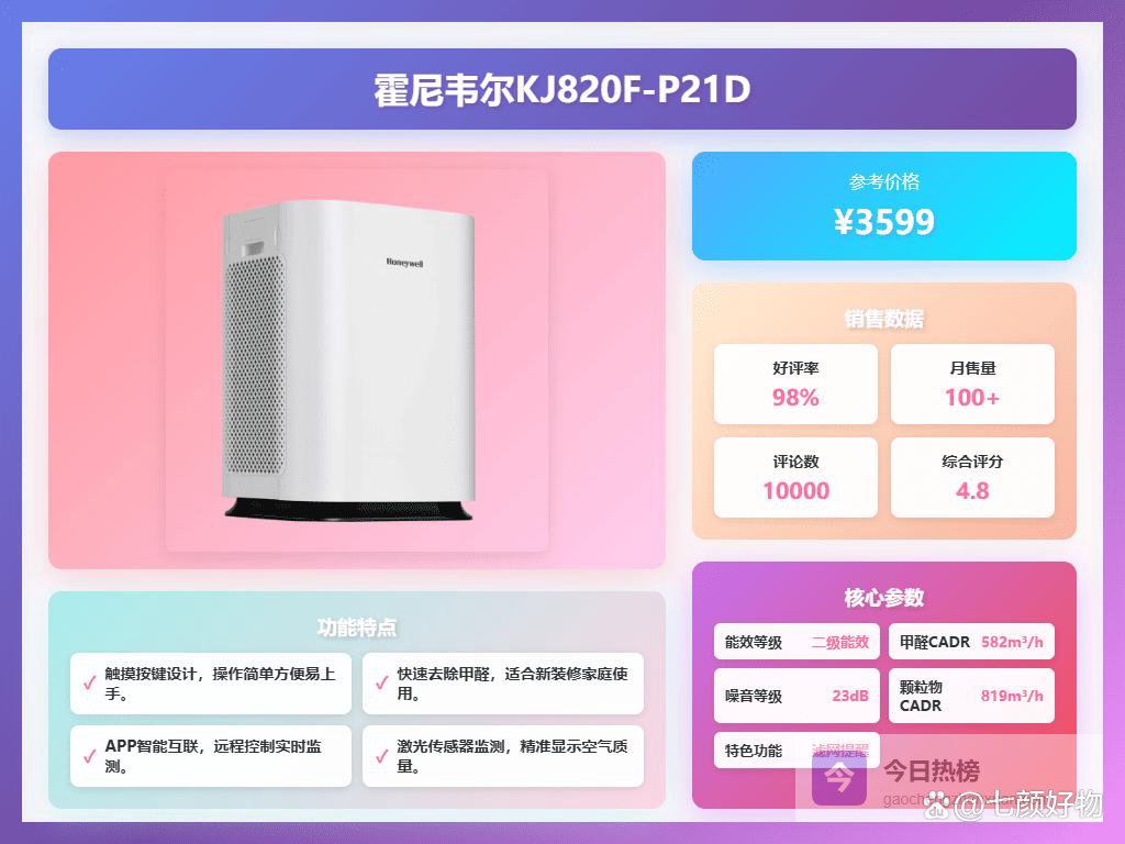 二、霍尼韦尔这款霍尼韦尔KJ820F-P21D空气净化器,配备智能滤网提醒,用起来还挺贴心的。滤网一用久了,它会“提醒你换新鲜的”,省得你一头雾水以为它还在勤奋工作。加上睡眠模式,夜晚静默运行也能让你安心睡觉,不用担心吵醒了梦乡,就像睡在森林里的小夜灯一样温柔。