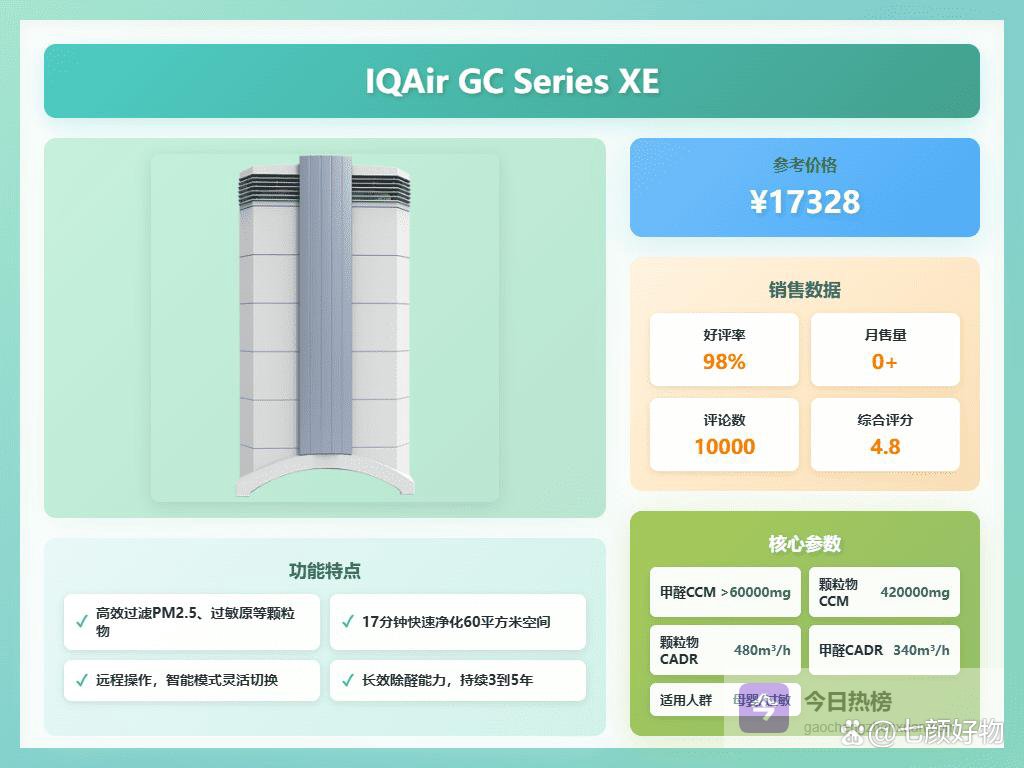 四、IQAir这款 IQAir GC Series XE 主要的亮点就是长效除醛,可以持续净化空气三到五年还不带喘气。试了下,40分钟左右,甲醛几乎清零,特别适合刚装修完或者家里有过敏体质的小伙伴。它的HyperHEPA过滤技术更是厉害,能把PM2.5、细菌和病毒都搞定,呼吸感真是正经好不少。