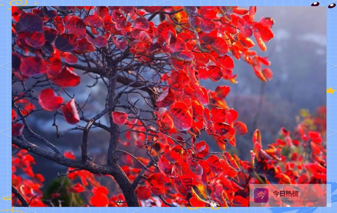 嵩山红叶以黄栌为主,辅以枫树、椿树、漆树,20 km²的林海同时变色,色块之丰富堪比香山。观赏分三阶: