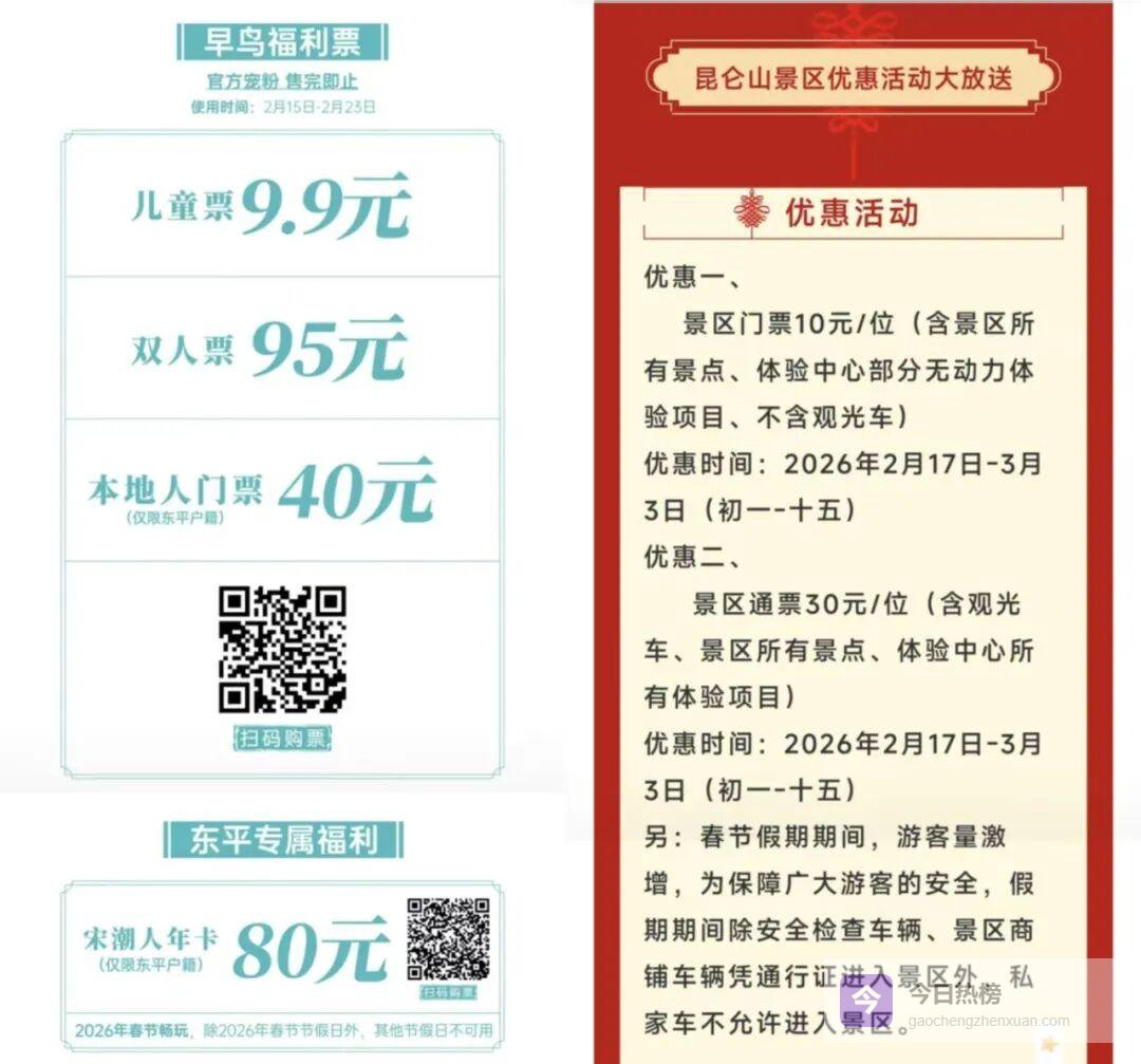 为让更多游客共享东平文旅发展成果,各景区重磅推出系列惠民优惠政策,精准覆盖不同出游群体,以亲民价格激发消费活力,推动旅游市场持续升温。大宋不夜城等核心景区推出焕新开园套票、限时早鸟票、温馨亲子票等多款特惠票型,满足家庭出游、好友结伴等多元游玩需求;针对老年人、未成年人、退役军人和在校大学生推出55元优待票,还专门推出本地人门票和年卡,彰显对特殊群体和本地市民的关怀。开展“大学生免费逛宝藏小城”特色活动,大学生发布东平游玩原创旅行作品,即可兑换景区联票免票资格,吸引年轻群体打卡东平;部分景区官方公众号线上领取门票券,同步增设线下地推点位,推出马年生肖票等特色优惠票种。针对旅行社推出专项激励政策,组织来东平的旅行社团队可享受“阶段性10免1”和“阶段性返现”,带动团队旅游市场发展。