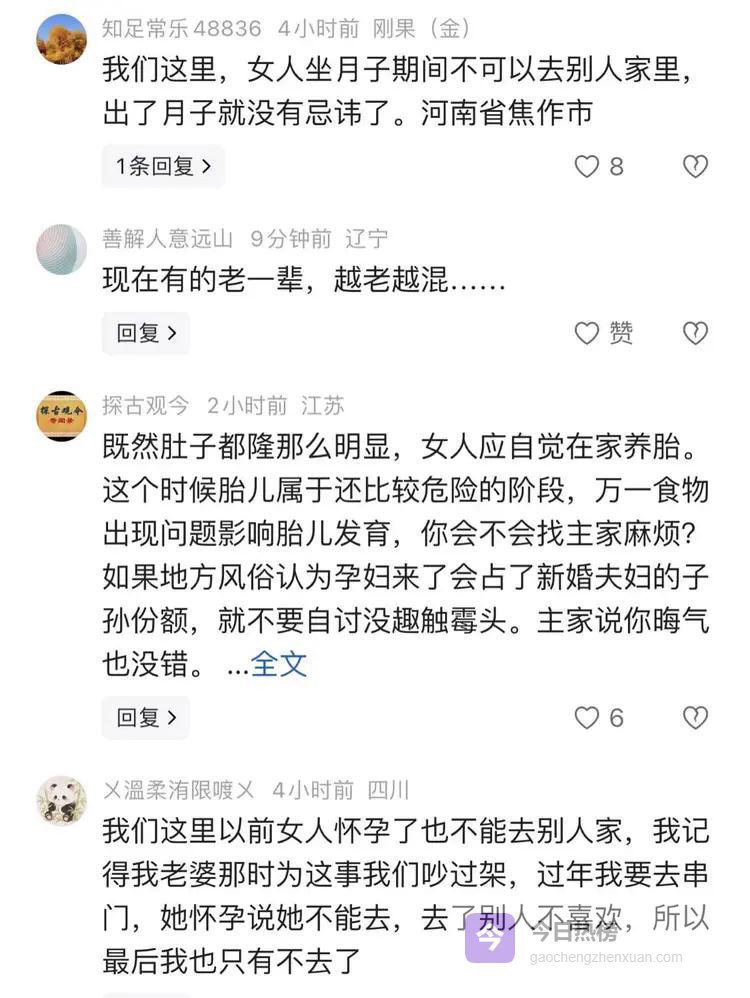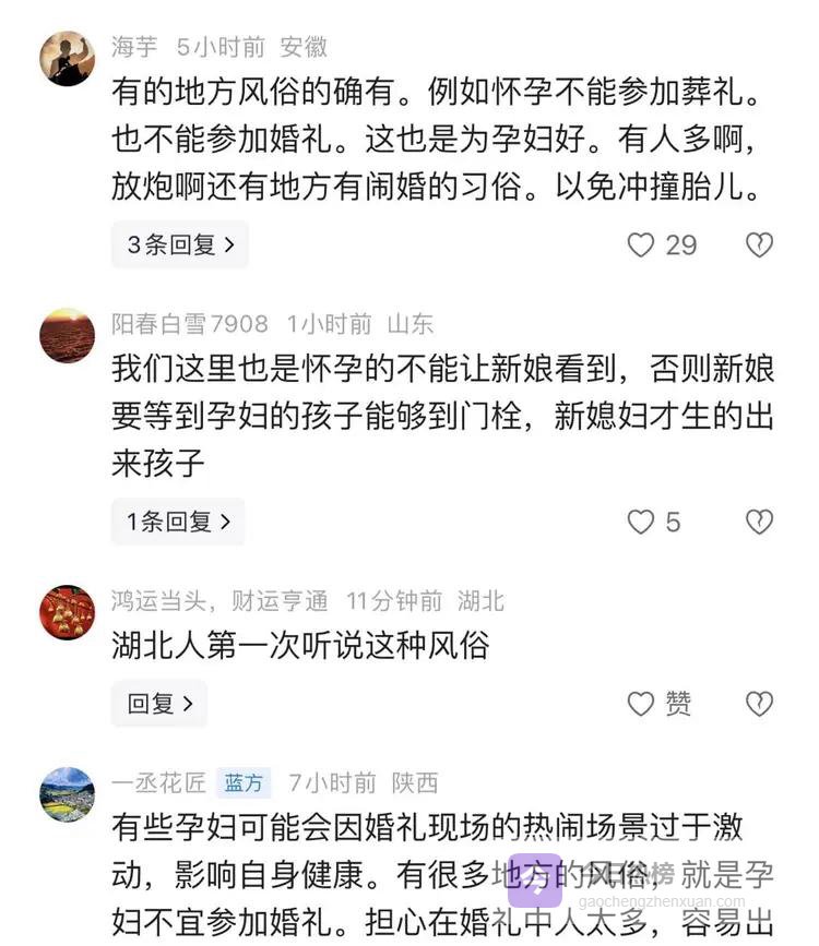针对此事,有网友表示,有的地方风俗的确有。例如怀孕不能参加葬礼。也不能参加婚礼。这也是为孕妇好。有人多啊,放炮啊还有地方有闹婚的习俗,以免冲撞胎儿。