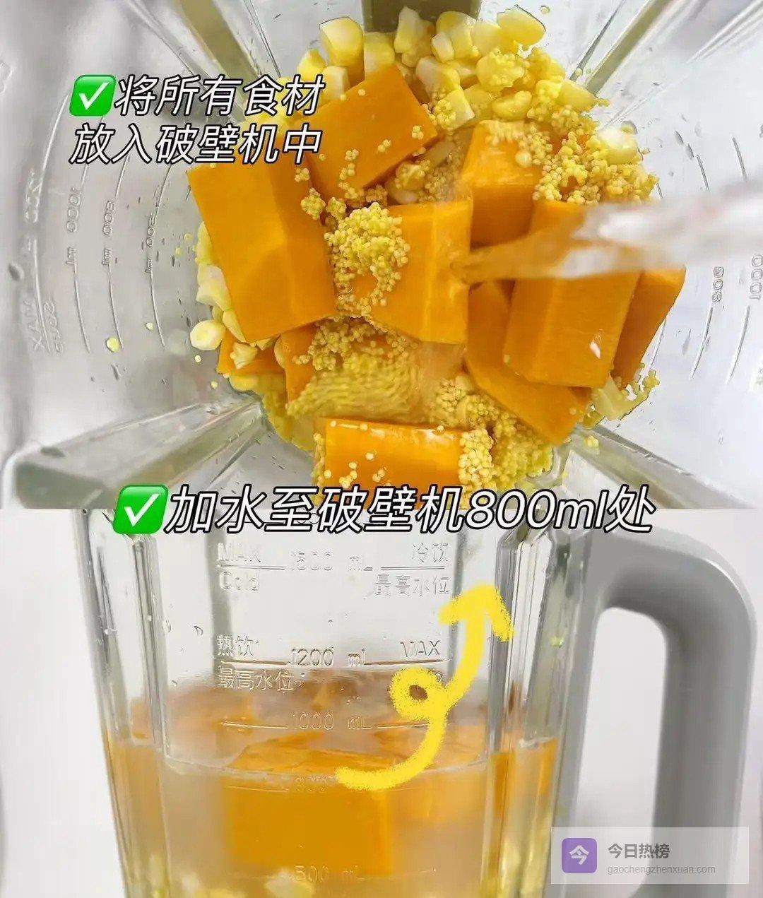 3. 将已经泡好的小米、切成块的南瓜还有玉米粒,统统倒进破壁机或者豆浆机里;