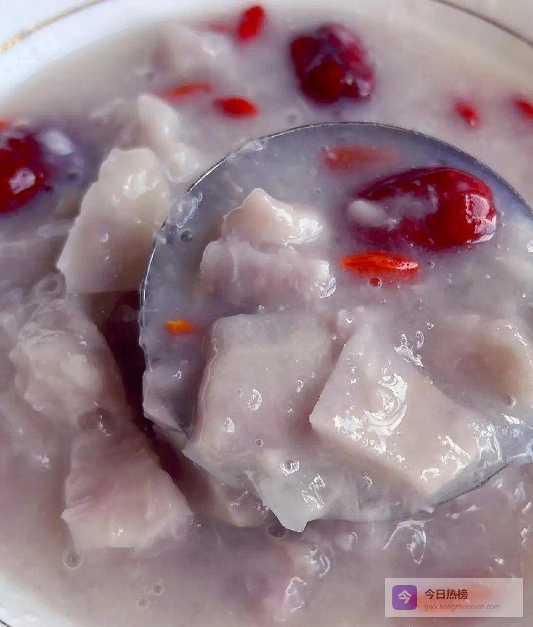 香芋本身口感绵软粉糯,和带着淡淡甜味的枸杞一起熬成羹,喝起来细腻顺滑又暖身。枸杞里的好东西能让脸色更红润,香芋吃了容易饱腹,下午用来垫肚子再合适不过,比啃蛋糕可健康不少。