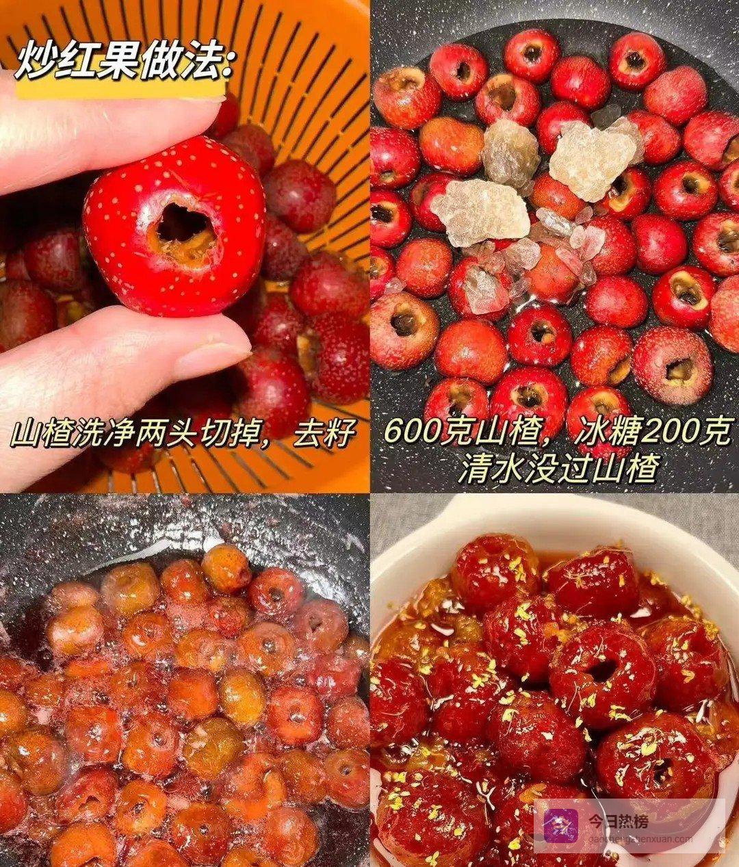 1. 把山楂冲洗干净,拿刀子把蒂头和里面的籽去掉(也能用根吸管,从山楂一头插进去,就能方便地把籽弄出来);