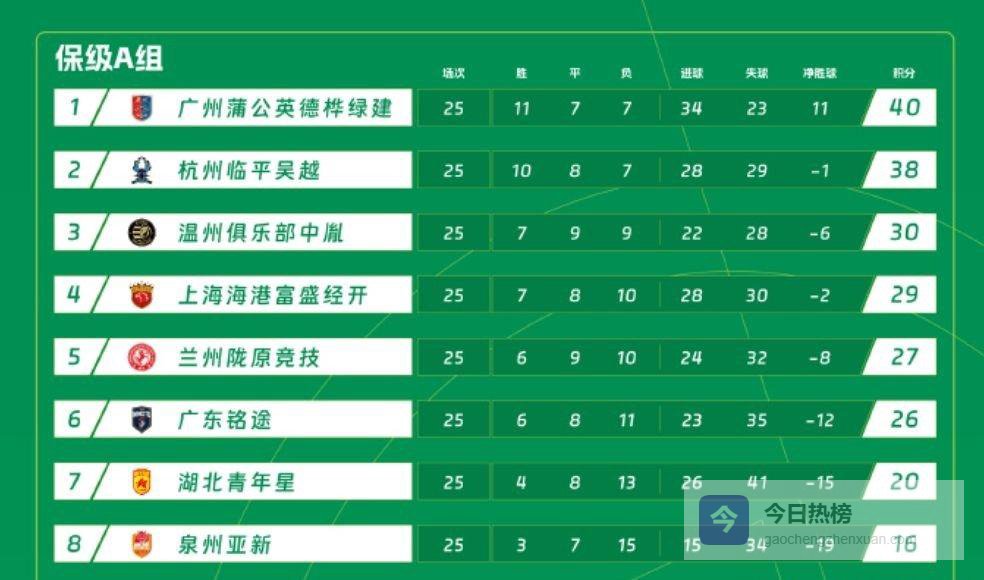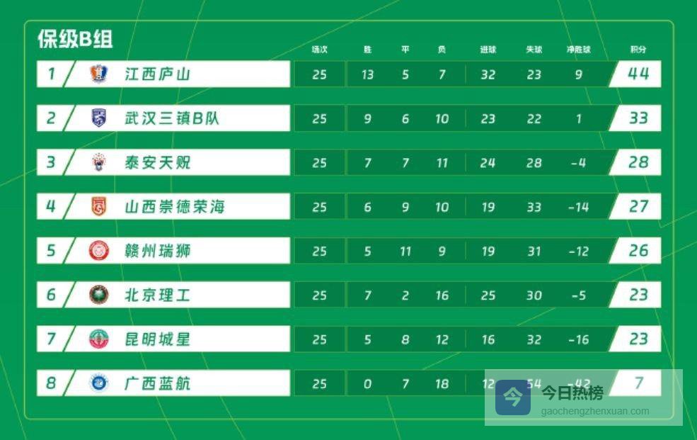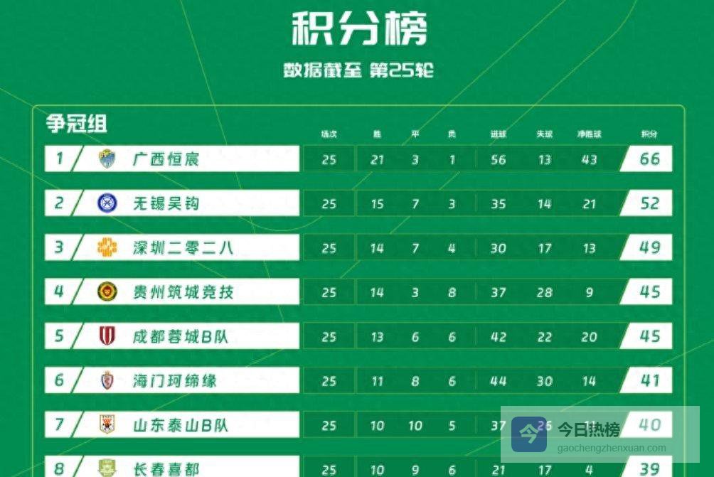 此外,已成功升入中甲的广西恒宸队目前积66分,领先排在第二、积52分的无锡吴钩队14分。碰巧的是,下一轮广西恒宸将直接与无锡吴钩对阵,只要打成平局,就能提前四轮确定获得中乙联赛冠军。上赛季广东广州豹队曾提前四轮冲甲成功、提前三轮夺冠,现在广西恒宸队或许能刷新这一纪录,实现提前五轮冲甲、并有望提前四轮夺冠的壮举。
