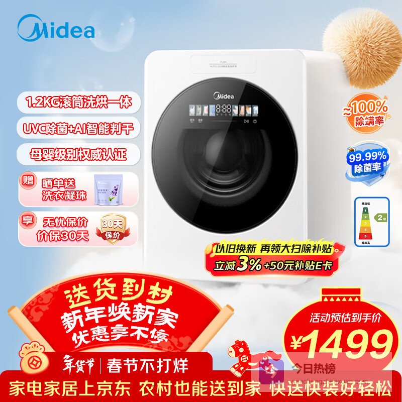 美的(Midea)1.2KG迷你滚筒全自动内衣洗衣机云初Y2 家用小型懒人洗衣机双效除菌AI智投洗烘一体机MND12VD1E¥