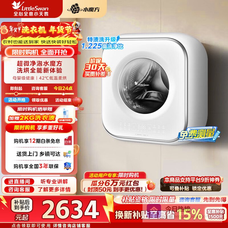 洗烘一体:洗完衣服还能直接烘干,省掉晾晒的时间,特别适合冬天或空间有限的房子,想快点搞定衣服这块儿,这个功能挺实用的。