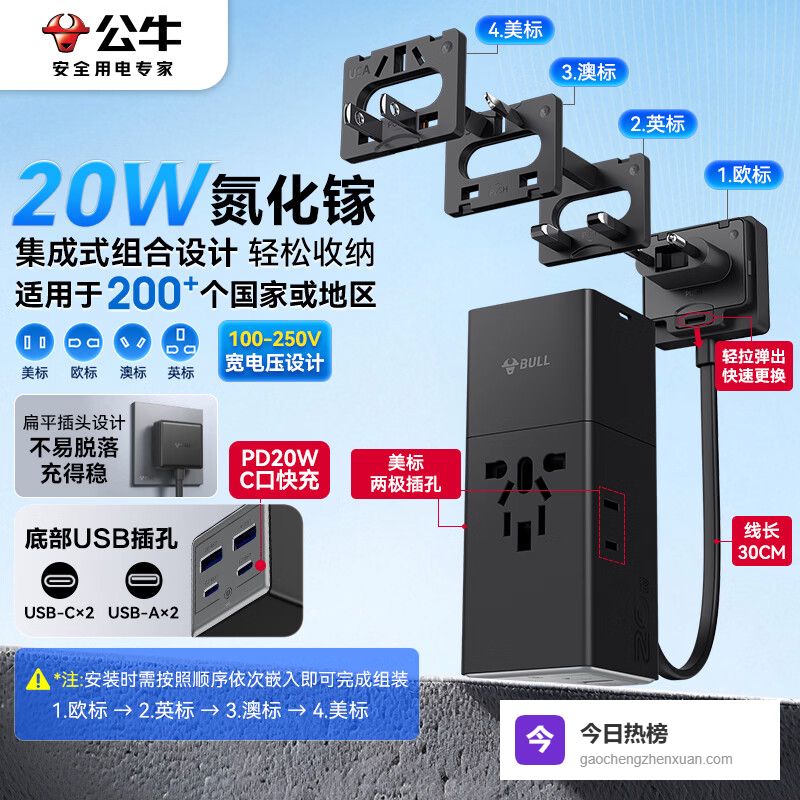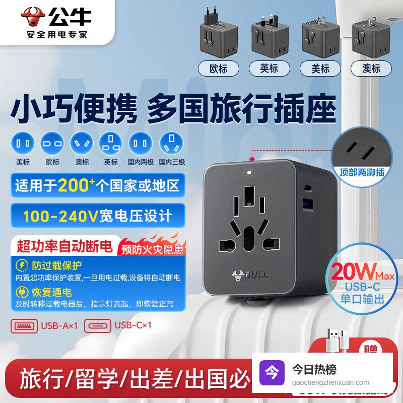 ①公牛20W氮化镓快充多国转换插头出差飞欧洲、打卡东京、转机悉尼——插头一换全搞定!这款公牛转换插头兼容欧标、美标、澳标、英标四大主流接口,不用再塞一堆转接头进背包。它用的是氮化镓技术,体积比传统插头小一圈,但发热控制更稳,长时间插在酒店墙插上也不烫手。插拔手感清脆利落,卡扣咬合紧密,不会一碰就松脱。