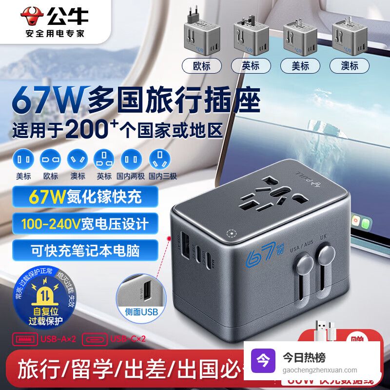 ②公牛67W多国转换插头配USB-A双协议一个人带三台设备出门?手机、平板、降噪耳机轮着用,电量告急太常见。这款公牛转换插头主打67W大功率+USB-A单口组合,专为需要快速回血的差旅族设计。它不是堆参数,而是把功率分配得刚刚好:墙插端吃满67W,USB-A口能智能识别设备,给老款安卓或Switch稳定输出18W,不伤电池也不拖速度。