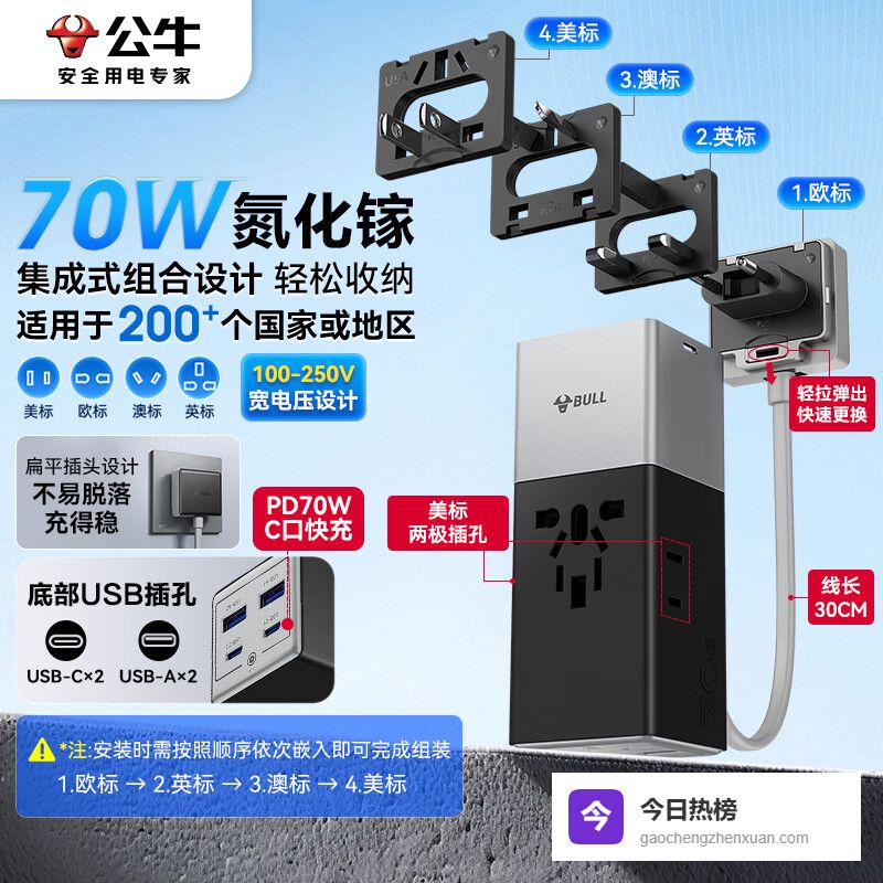 公牛(BULL)70W氮化镓快充多国插座畅行世界转换插头/出国旅行出差留学自带线防脱落多孔插头欧标美标澳标英标¥