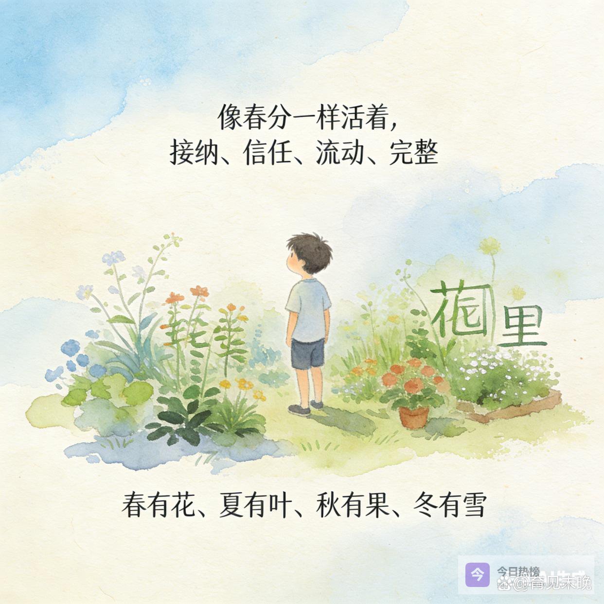——不执着于某个固定的完美状态,允许自己随着生命的季节,调整自己的重心。春天就好好生长,夏天就尽情绽放,秋天就坦然收获,冬天就安静蓄能。像春分一样完整