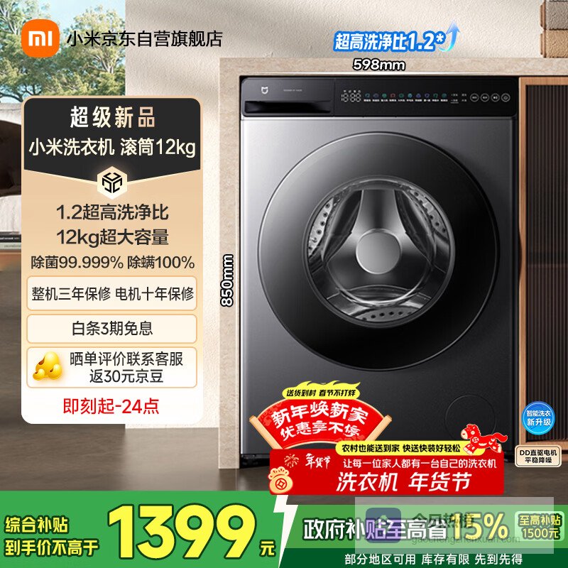 【京东自营】米家小米滚筒洗衣机全自动12公斤大容量超薄嵌入高洗净比一级能效国家补贴XQG120MJ1¥