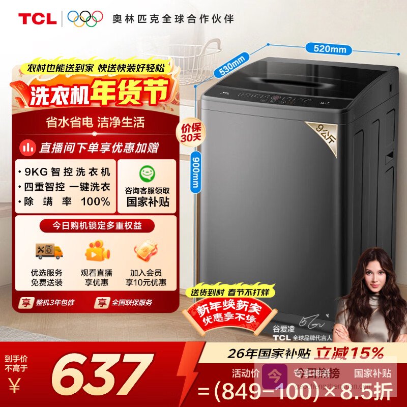 【京东自营】TCL升级款波轮9KG大容量洗衣机全自动家用宿舍租房家电国家补贴以旧换新一级能效B90L¥