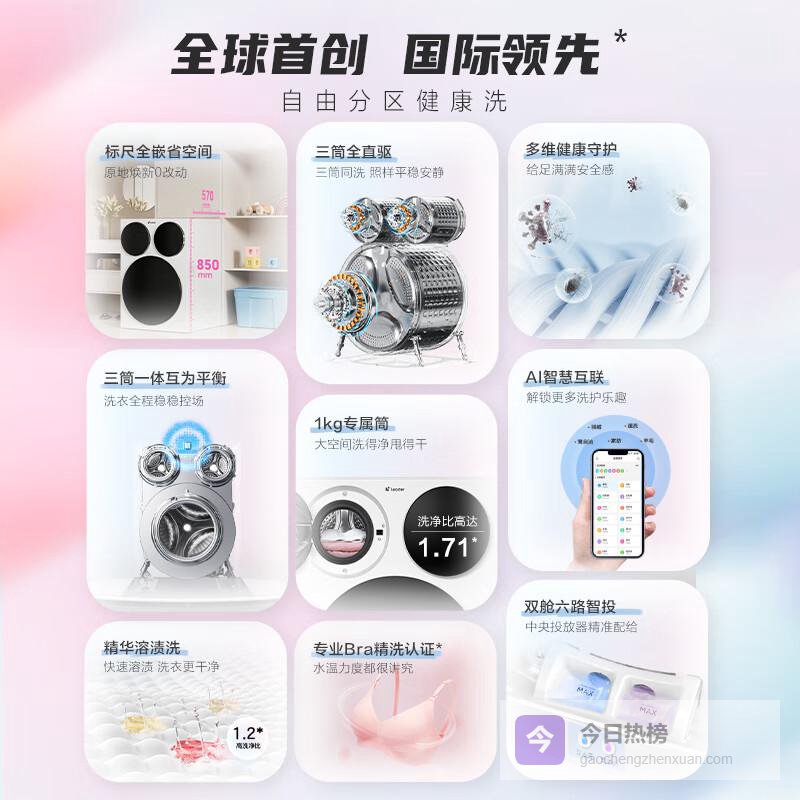 独特三筒设计:创新的三筒结构可以高效地处理不同类型的衣物,充分利用空间,节省时间。从内衣到外套,所有衣物都能在同一时间内得到清洗,极大地提升了洗涤效率。用户再也不用担心分类洗涤带来的麻烦,随时享受洁净的衣物,方便又快捷。