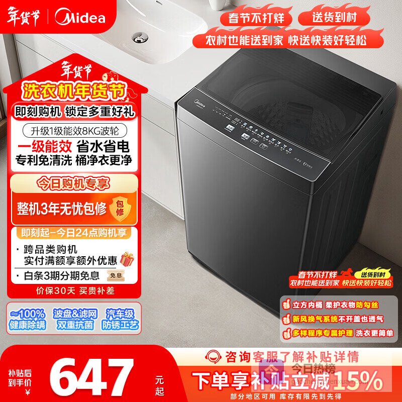 【京东自营】美的随心洗波轮洗衣机全自动8公斤小型家用免清洗一级能效MB80V37T以旧换新国家补贴京¥