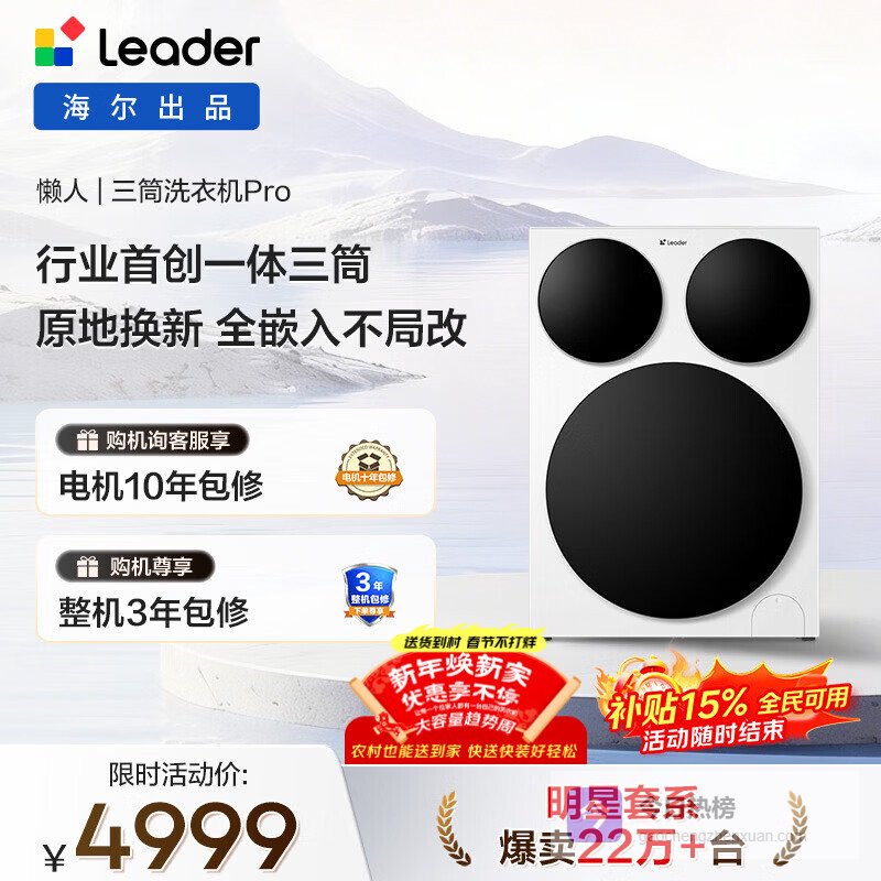 【京东自营】统帅海尔出品懒人三筒洗衣机Pro内衣洗全自动直驱三桶换新补贴12.5公斤林高远XQGL1¥