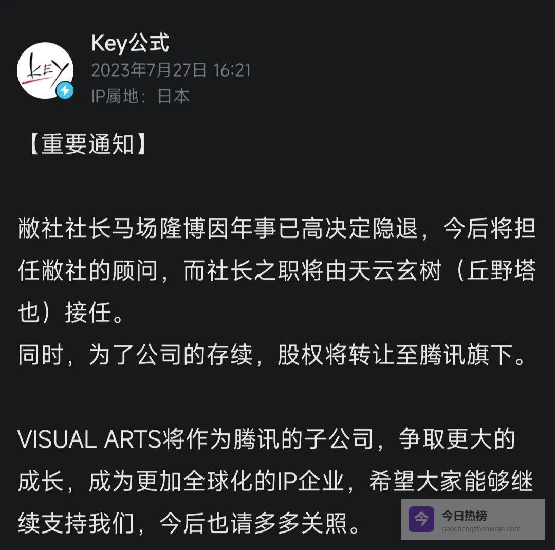 2023 年 7 月 24 日下午,Key 社母公司 Visual Art’s 的社长马场隆博突然宣布引退,并将全部股份转让给国内某巨头——鹅厂。这意味着 Visual Arts 正式成为鹅厂旗下的子公司。消息一出,二次元圈瞬间炸锅:那个用“一封情书”就能让人哭到停不下来的小工作室,真的要变成“大厂产品”了吗?