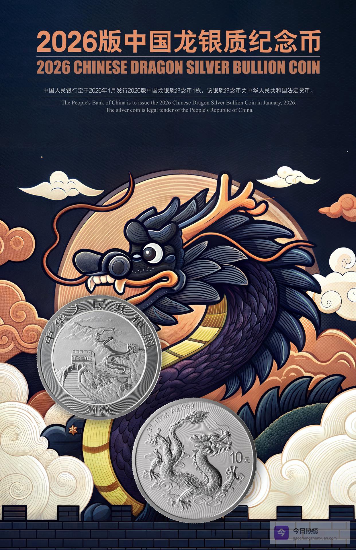 2026版中国龙银质纪念币甫一亮相,背面腾龙便收获满屏惊叹;翻到正面,长城图案却以更隐忍的雄浑抢走风头——它不再只是地理坐标,而成为一枚被时间反复打磨的精神图腾,把“山河”二字直接刻进每个人的视网膜。