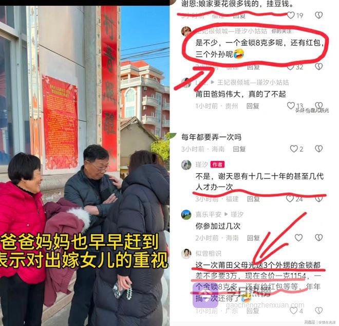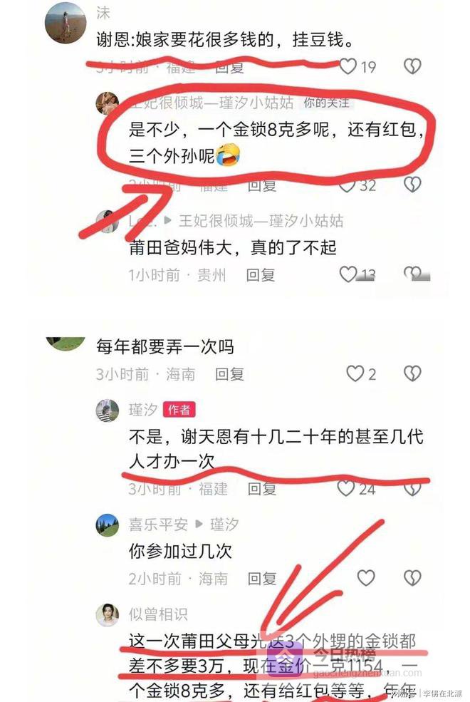 瑾汐的莆田妈妈对三个外孙出手阔绰。莆田妈妈在女儿家族谢天恩感恩习俗中,送了3个外孙3个大金锁,价值3万多,另外还有红包。
