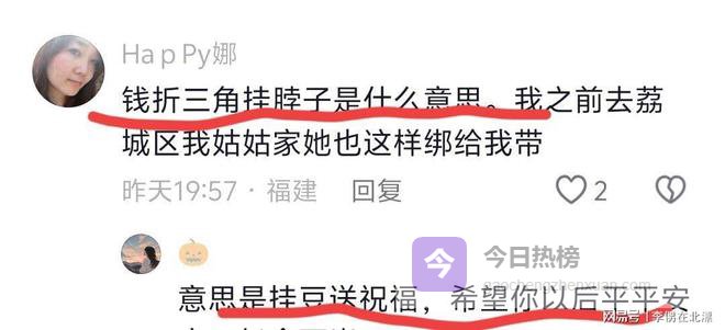 他们还给三个外孙挂用钱折成的三角形,意思是挂豆送祝福,希望外孙以后平平安安、长命百岁,同时每个外孙还有一个大红包。