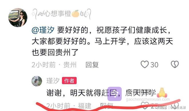 在瑾汐的评论区得知,她今天将带三个儿子回贵州,因为孩子即将开学。瑾汐是在昨晚回复网友的。