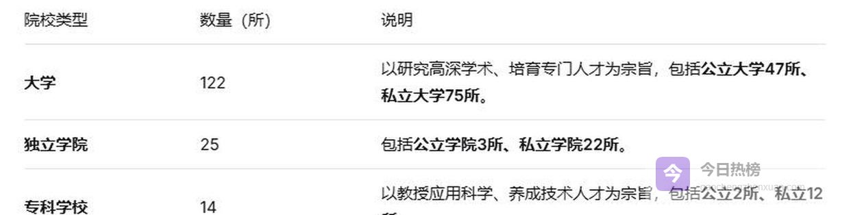 台湾的高等教育体系分得挺细,有大学、独立学院还有专科学校,加起来161所。其中普通大学122所,公立47所、私立75所;学院25所,公立3所、私立22所;专科学校14所,公立2所、私立12所。