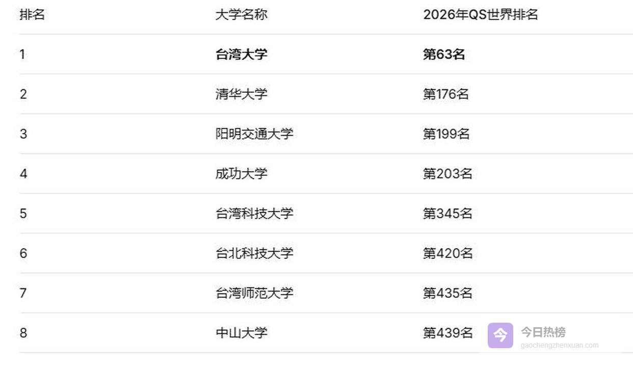 2026年QS世界大学排名刚一发布,台湾高校的表现就再度被推上风口。全省足足161所高等教育学府,掰着手指头数,也就只有台湾大学挤进了全球前100强,排在第63名。清华大学(台湾)和阳明交通大学稍显勉强,分别落在176名和199名,堪堪蹭上前200的边。