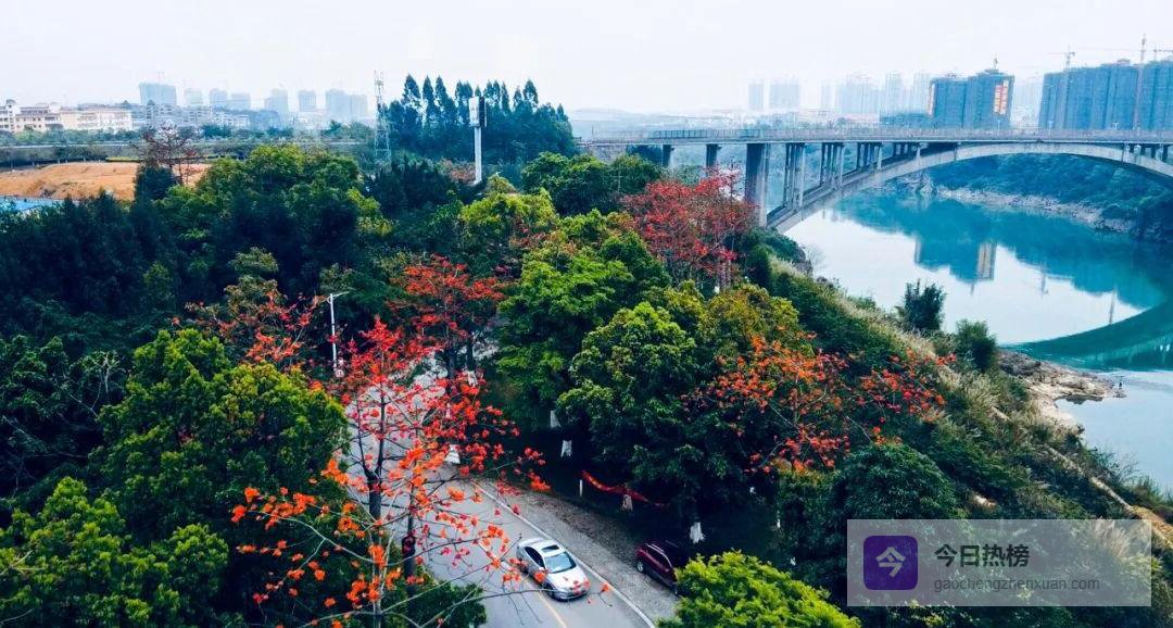 高空俯瞰,滨江北路像一条被红浪拍打的堤岸;一朵朵木棉化作点点火星,沿着河岸一路点燃到天际。镜头掠过,水城的水面也泛起碎金般的反光——原来“一城春色半城花”并非夸张,而是来宾此刻最真实的写照。