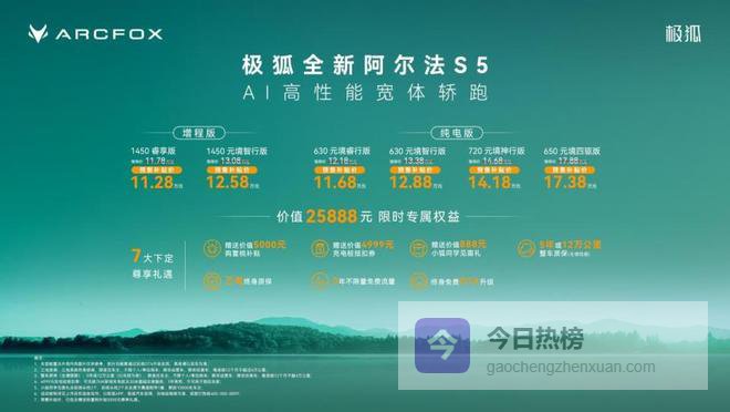 据了解,即日起下定全新阿尔法S5,用户可享受5000元购置税专项补贴、价值4999元家用充电桩抵扣券(安装服务以官方授权服务商为准)、包含高级舒适头枕和全景天窗遮阳帘在内的小狐同学见面礼、整车5年/12万公里质保、三电终身质保、3年免费不限流量和终身免费OTA权益等7重限时尊享礼遇,总价值至高25888元。
