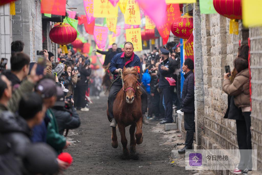 “来了来了!”不知谁喊了一句,刚刚还是人挤人的巷子,立刻闪出一条一米多宽的通道,五匹骏马前后奔出,伴随着吆喝声、锣鼓声、助威声,这条巷子瞬时沸腾了起来,跑马排——这项传承千年的春节民俗,也到了最高潮的时刻。